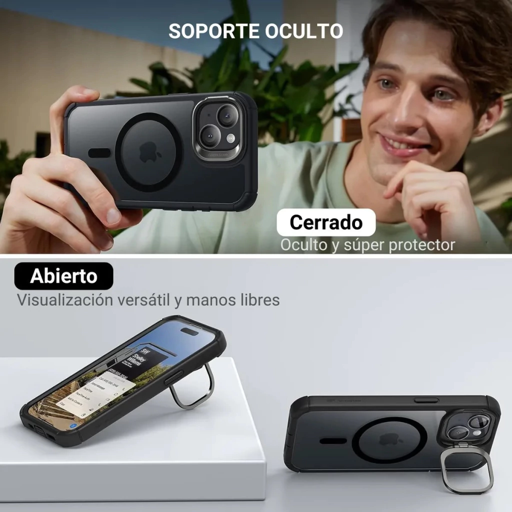 Disfrutá de la comodidad del soporte ajustable, perfecto para ver videos, realizar videollamadas o trabajar en tu iPhone sin usar las manos. Además, el soporte no interfiere con los accesorios MagSafe, lo que te permite seguir usando cargadores y otros dispositivos compatibles sin problemas.