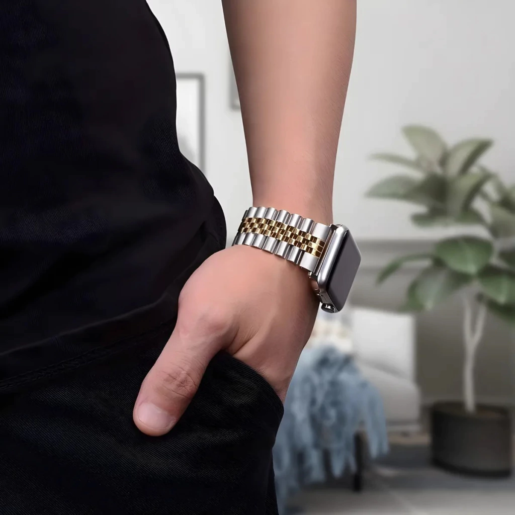 Potenciá tu Apple Watch con la Malla metalica de eslabones. Su diseño bicolor en plateado y dorado combina resistencia y elegancia, ofreciendo el equilibrio perfecto entre durabilidad y estilo sofisticado.
