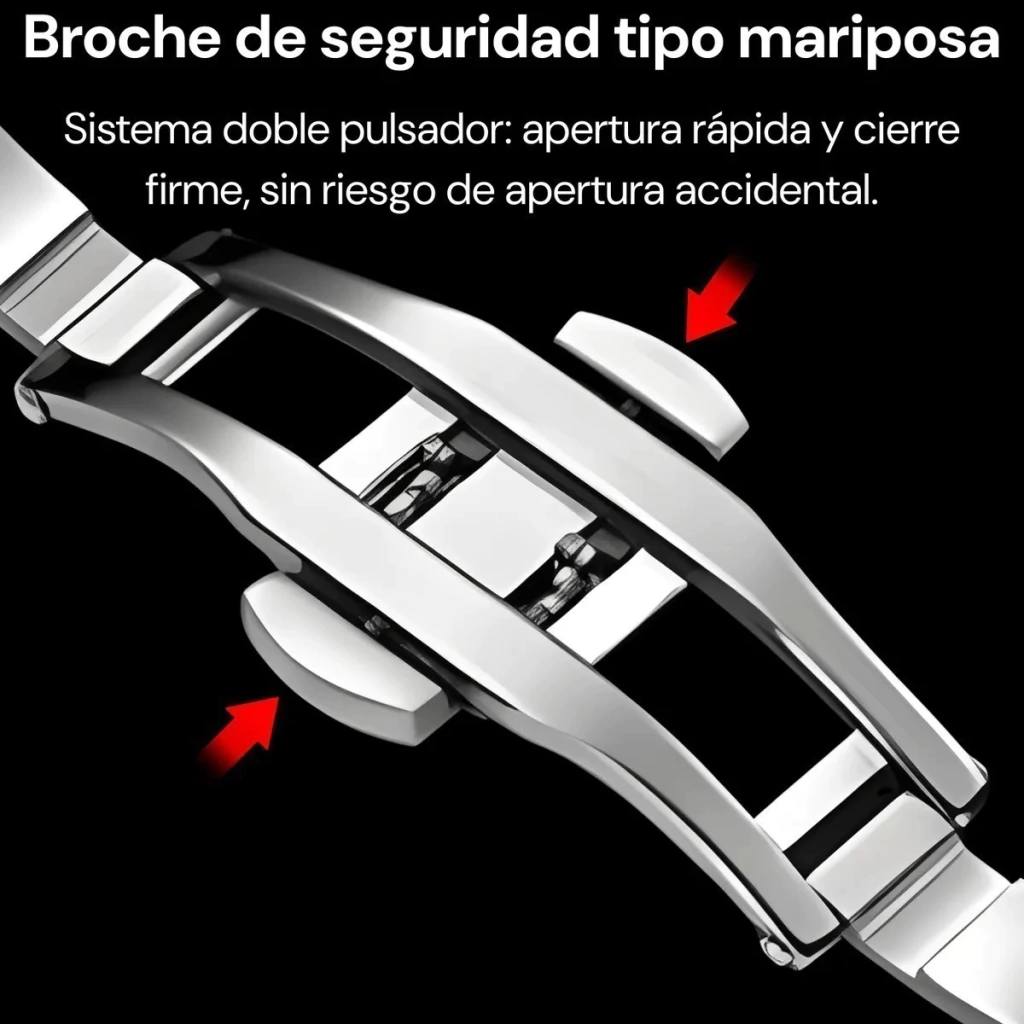 El exclusivo cierre mariposa tipo Rolex asegura máxima comodidad y seguridad: se abre con suavidad, se ajusta con firmeza y evita aperturas accidentales. Además, su diseño de 5 filas aporta una estética atemporal que realza cualquier look, desde el uso diario hasta las ocasiones más formales.